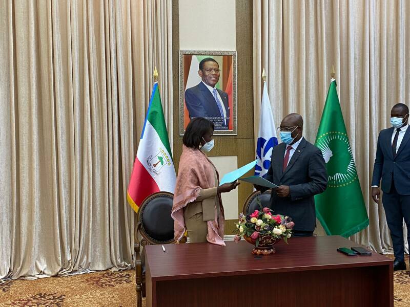 Cerimónia de Assinatura do Protocolo de Cooperação entre o Governo da Guiné Equatorial e a Confederação Empresarial da CPLP (CE-CPLP), por S. Exª o Ministro dos Assuntos Exteriores e Cooperação, Simeón Oyono Esono Angue, e a Vice Presidente da CE CPLP, Exmª Srª Nelma Pontes, no âmbito da realização da Cimeira de Negócios CE-CPLP, de 5 a 7 de Maio, em Malabo.